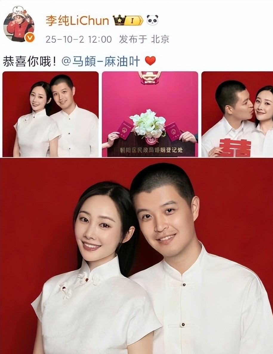 2025年10月2日,两人突然晒出红底照和领证现场的照片,互相喊话“恭喜你哦”,简单直接的官宣方式,反而比轰轰烈烈的求婚更打动人。